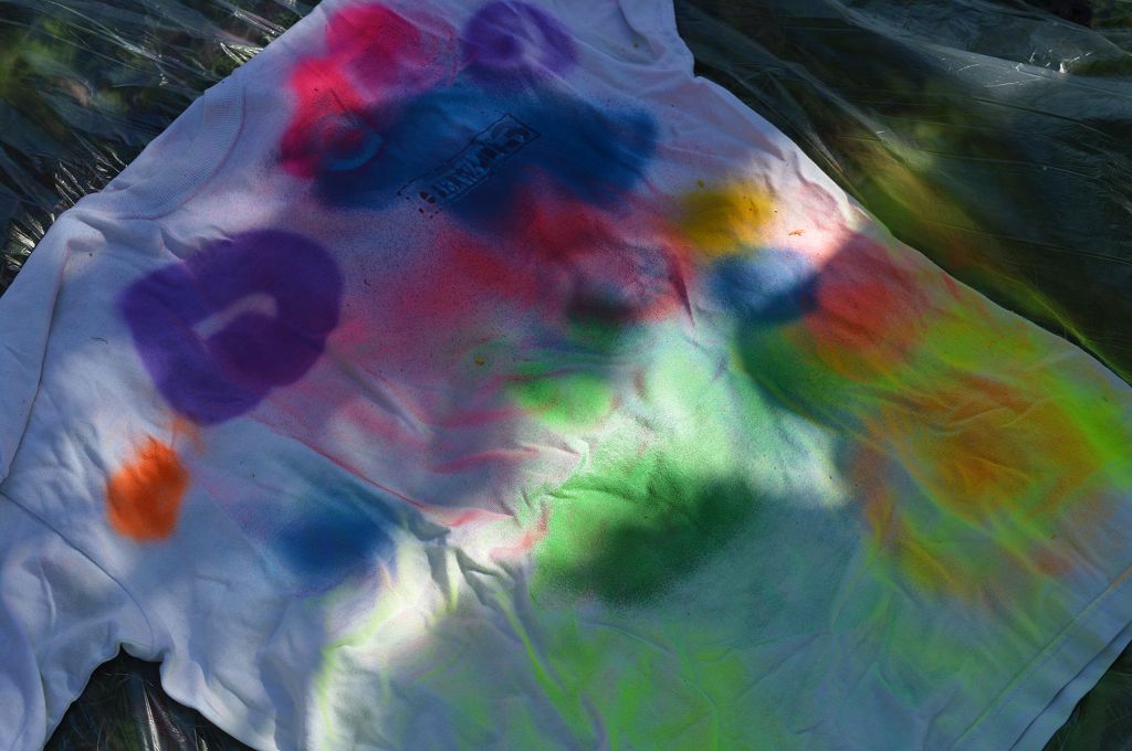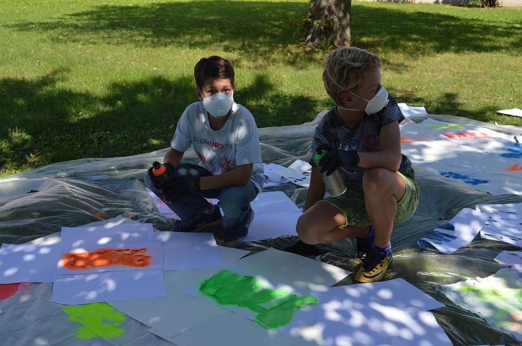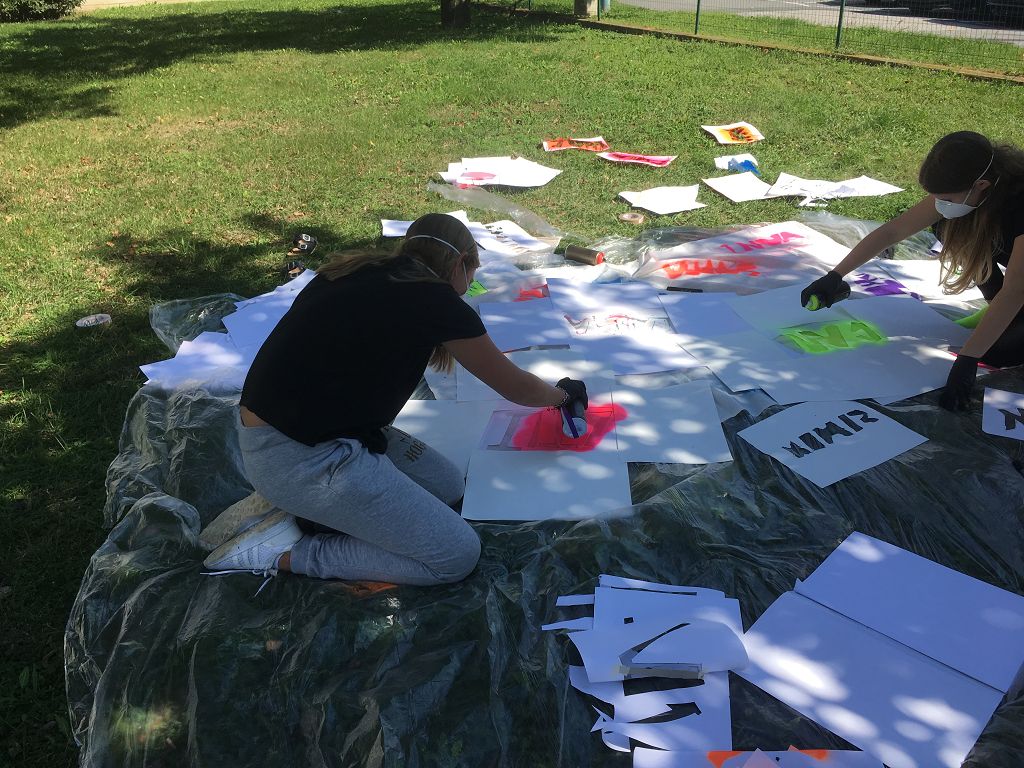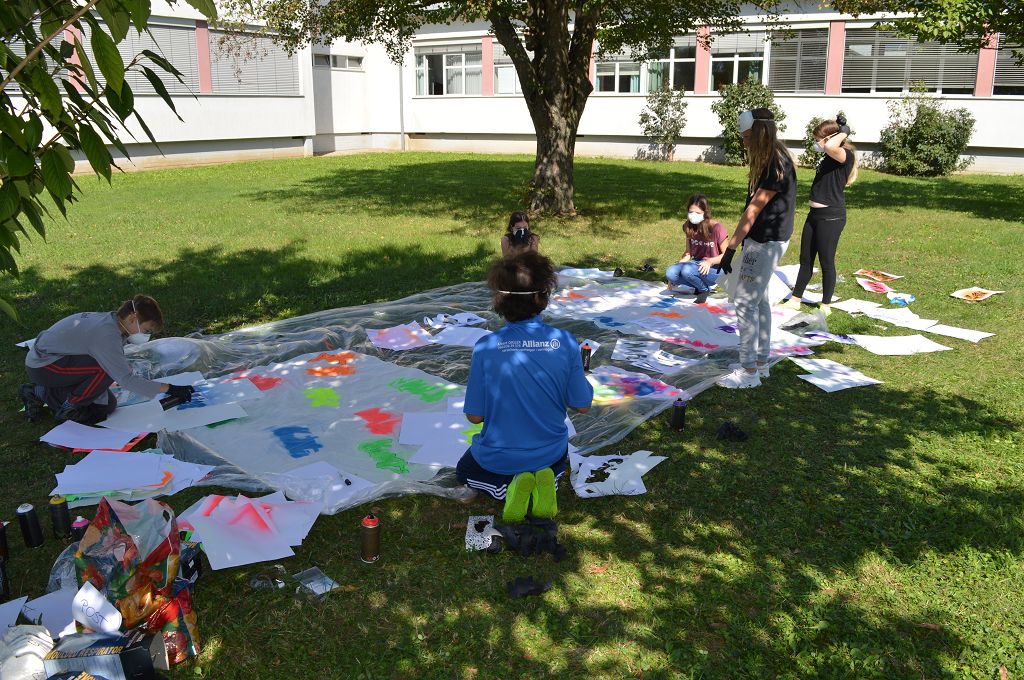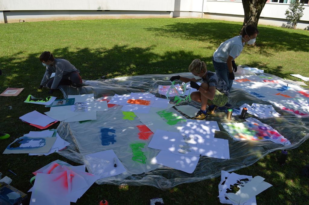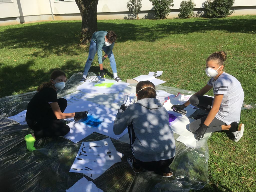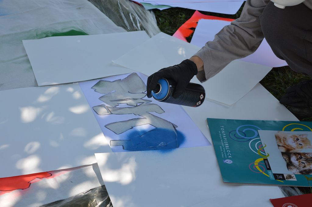 Sie lernten verschiedene Arten von Graffiti-Schriftzügen sowie Zeichentechniken kennen. Der krönende Abschluss des Projektes fand am 10. September 2018 im Pausenhof der NMS statt. Die Kinder durften, ausgerüstet mit einer Atemschutzmaske und Handschuhen, ihre vorgefertigten Graffiti-Namen mit Spraydosen auf ein Leintuch sprayen. Obwohl es für alle die erste Sprayer-Erfahrung war, hatten alle Schülerinnen udn Schüler einen riesen Spaß.