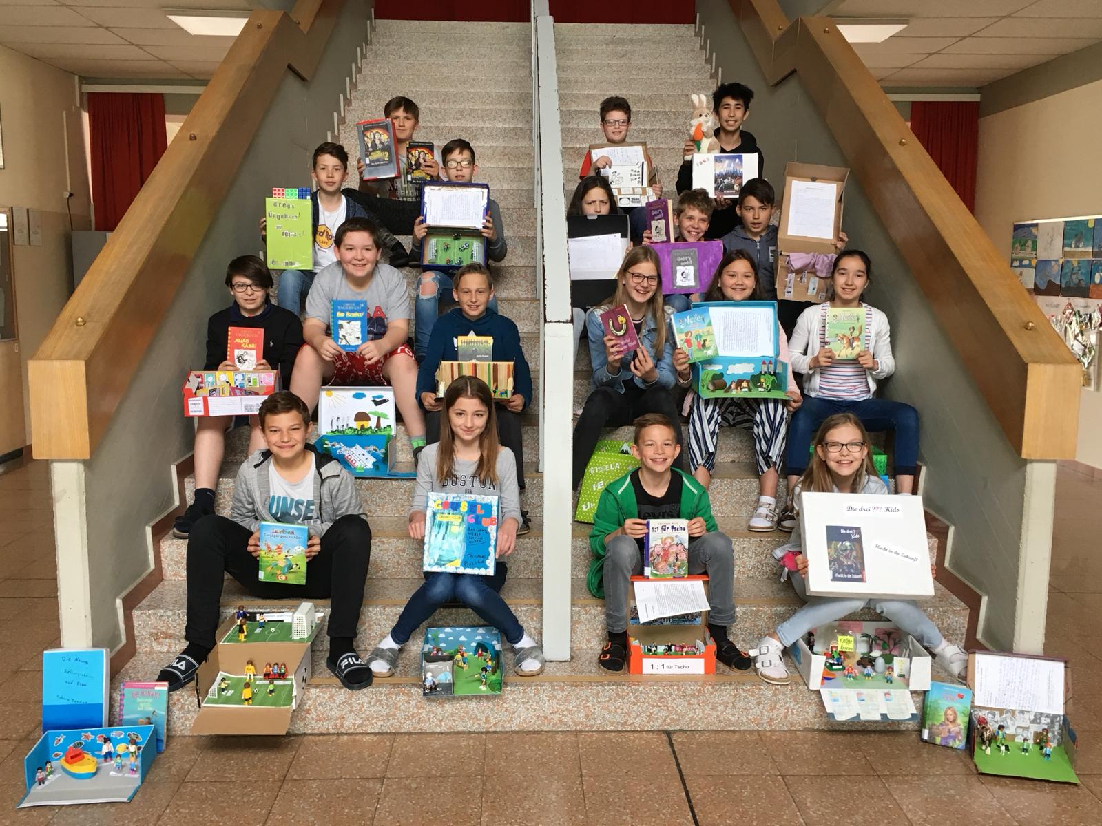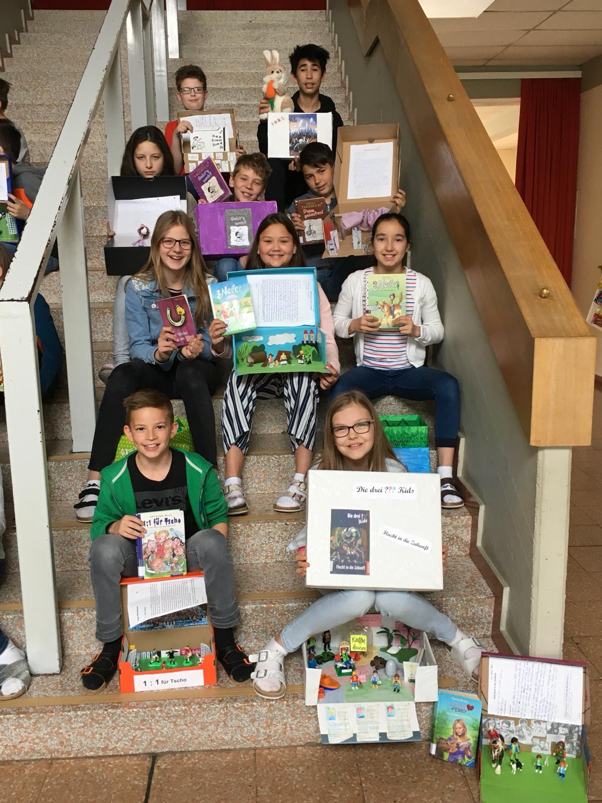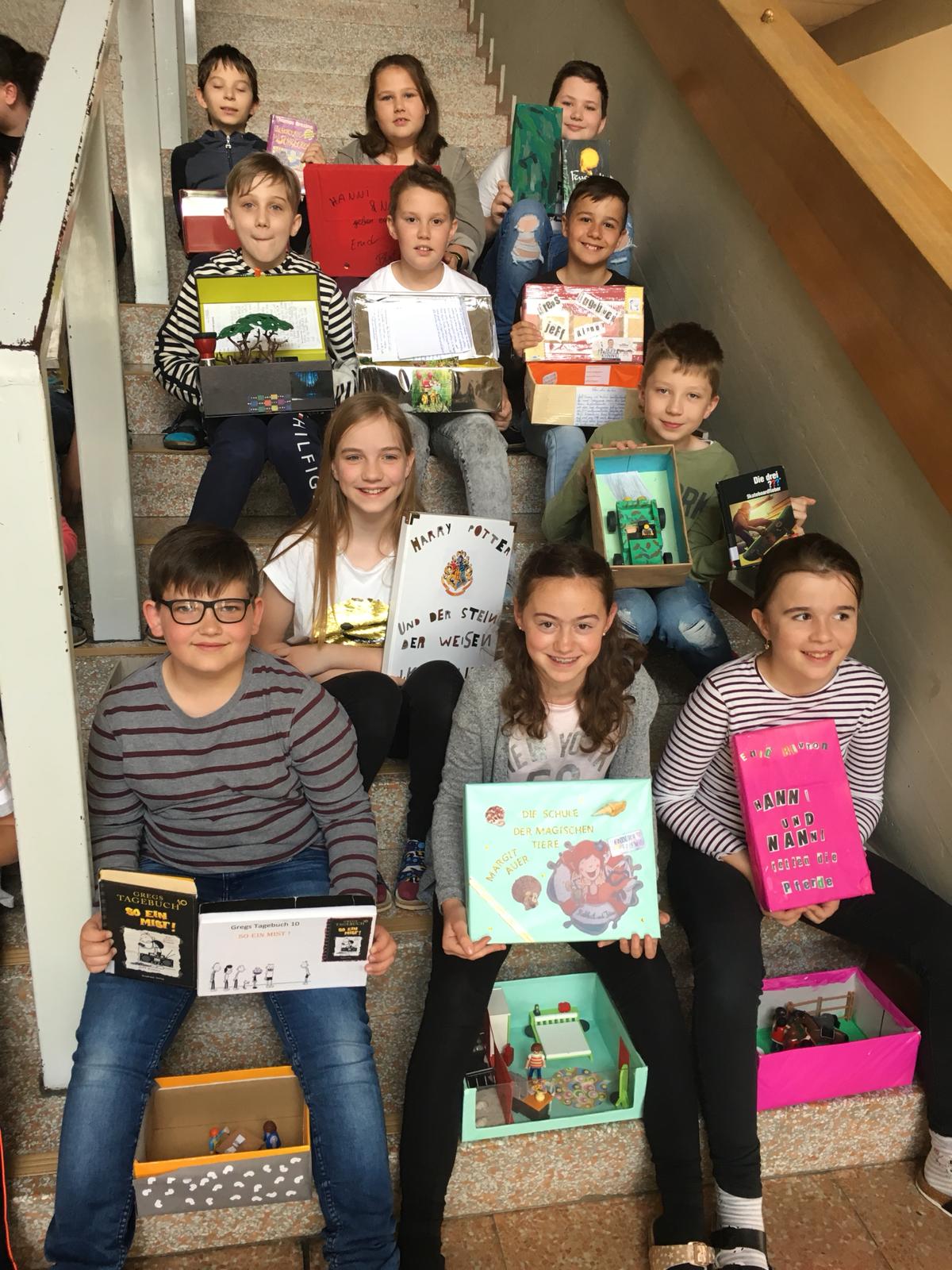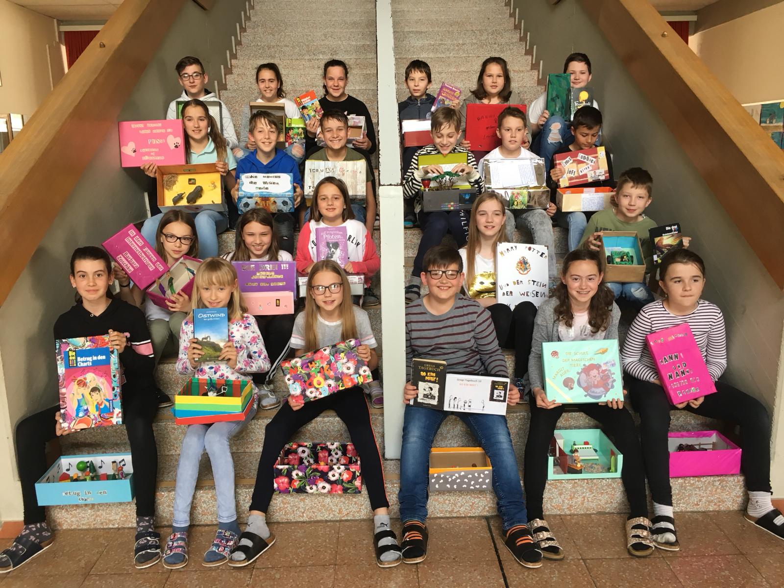 Im Deutschunterricht haben die Kinder der 1. Klassen Bücher aus der schuleigenen Bücherei ausgesucht, welche sie dann vorstellten und dazu eine Lesekiste anfertigten. Die Lesekiste entstand aus einem Schuhkarton, den die Kinder passend zu ihrem Buch beklebten, bemalten und mit kleinen Figuren oder Gegenständen zum Buch gestalteten.