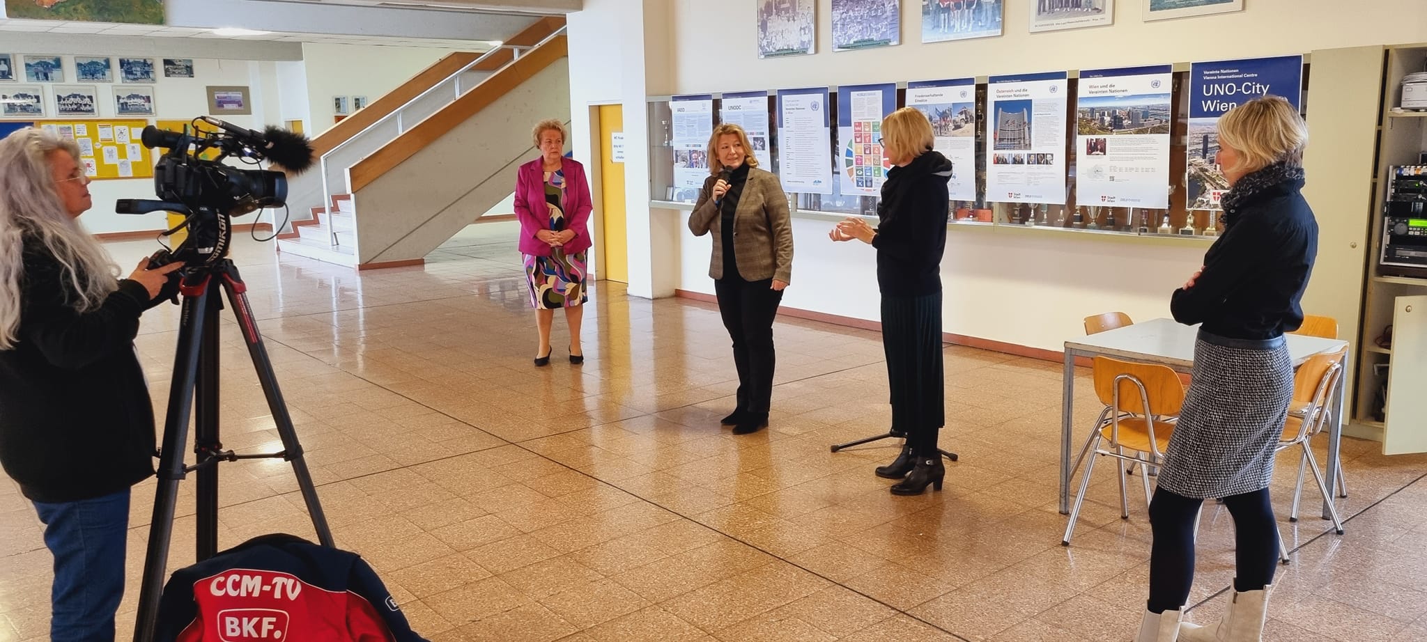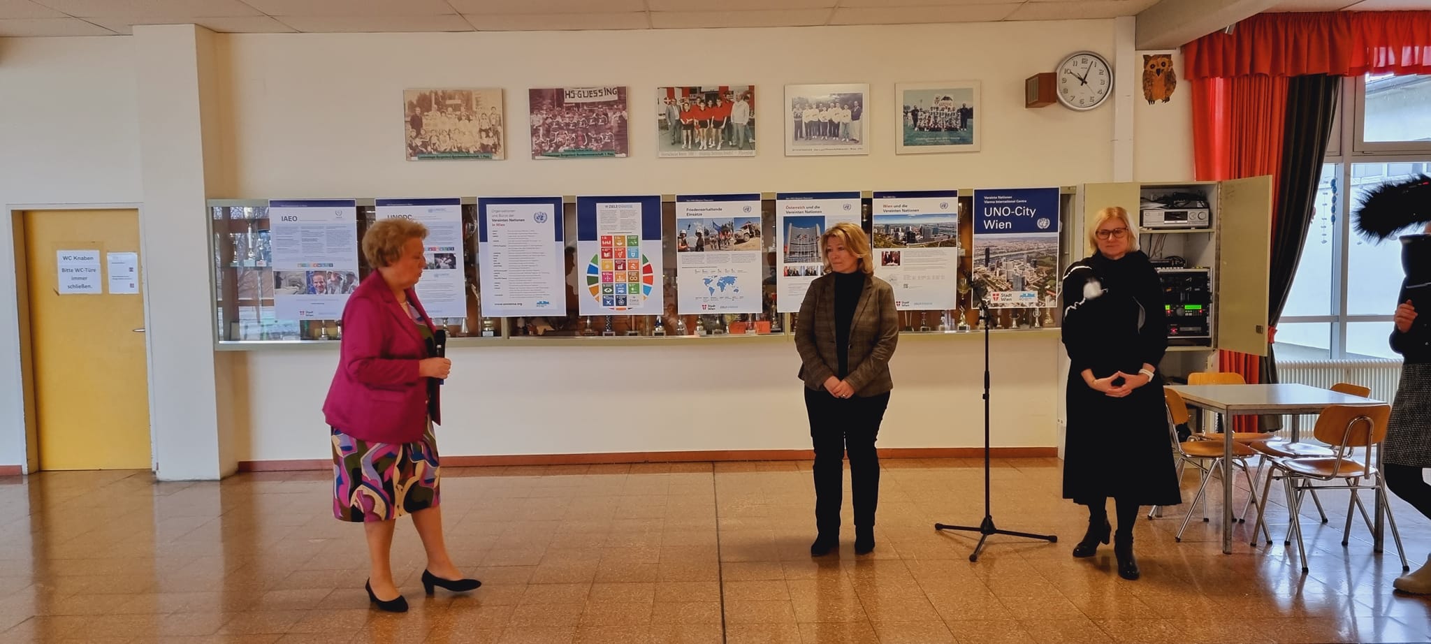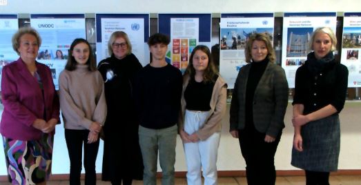 Seit 2.12.2022 informiert die Wanderausstellung „UNO City“ über die Bedeutung der Vereinten Nationen. Die Ausstellungseröffnung nahmen Landtagspräsidentin Verena Dunst, SQM Martina Bugnits und Schuldirektorin Martina Farkas vor.
