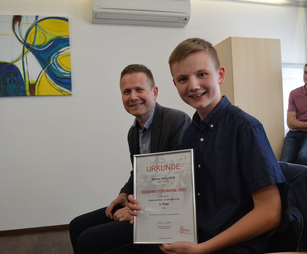 Simon Galliker, Schüler der 4b Klasse, erreichte in der Kategorie "Klassische Rede" beim Landes-Jugend-Redewettbewerb den tollen 3. Platz. Am 15. Mai 2023 fand in der Bildungsdirektion in Eisenstadt die Preisverleihung statt.