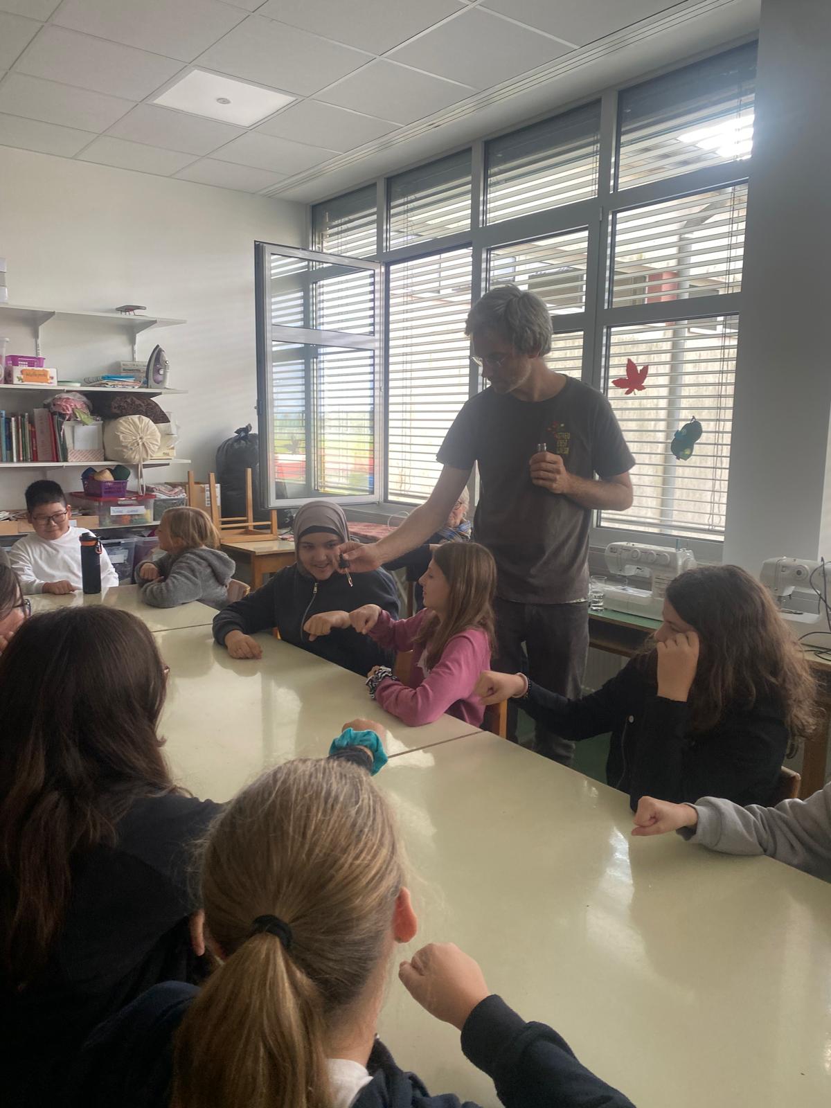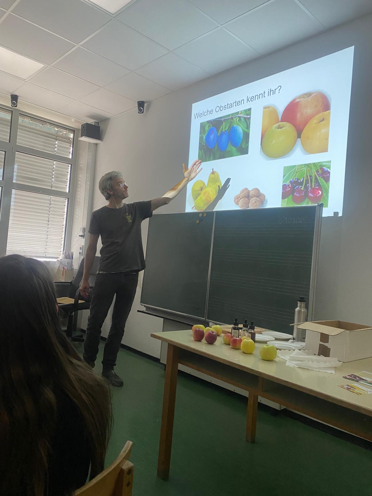 Am 8. Oktober 2025 fand für die Kinder der Nachmittagsbetreuung und der KIMS-Gruppe ein spannender Vortrag der Wieseninitiative statt. Die Schülerinen und Schüler erfuhren, welche Obstsorten es in den Streuobstwiesen der Region gibt, welche Produkte aus dem Obst hergestellt werden und welche Tiere und Pflanzen im Ökosystem Streuobstwiese vorkommen.