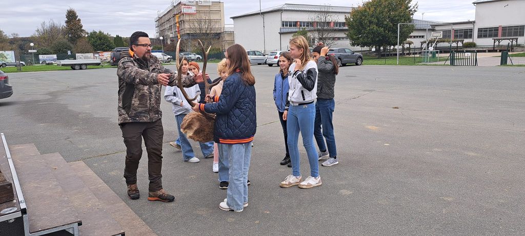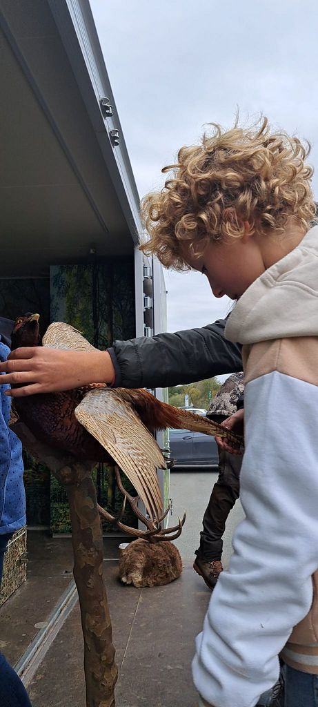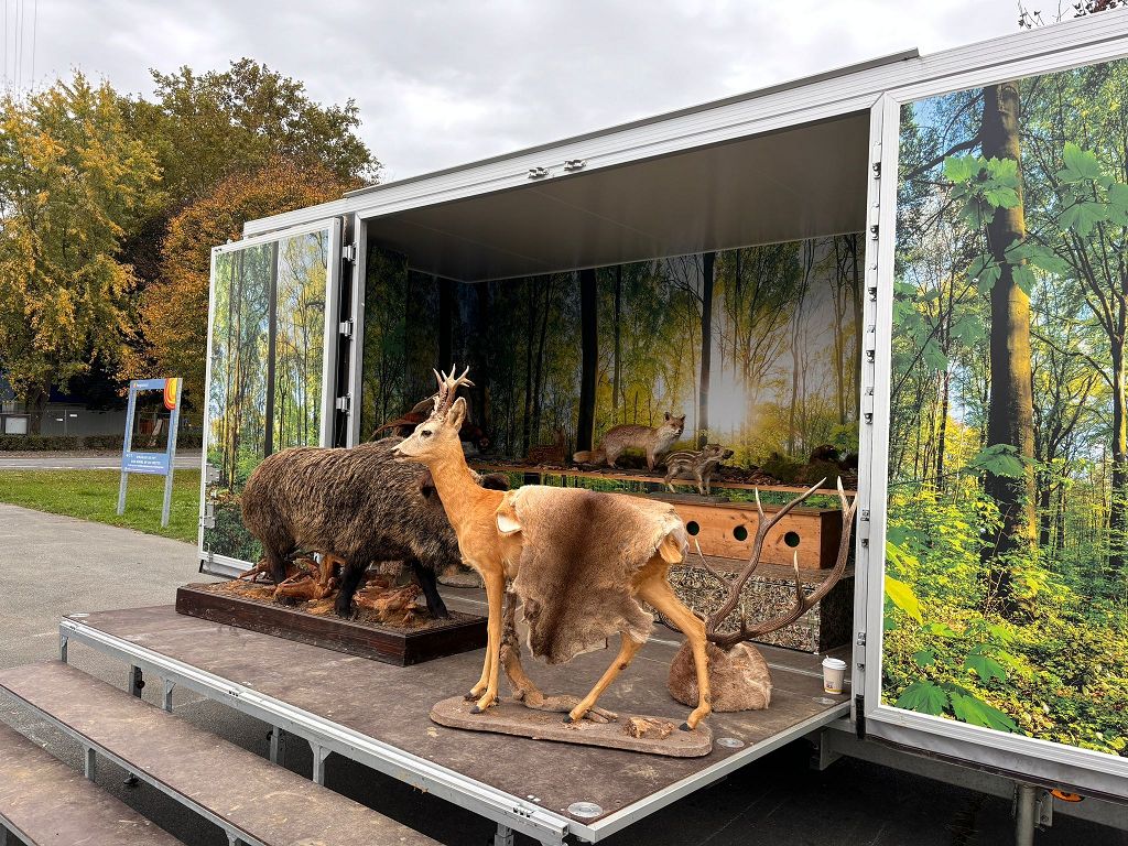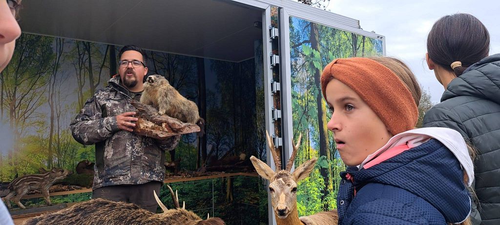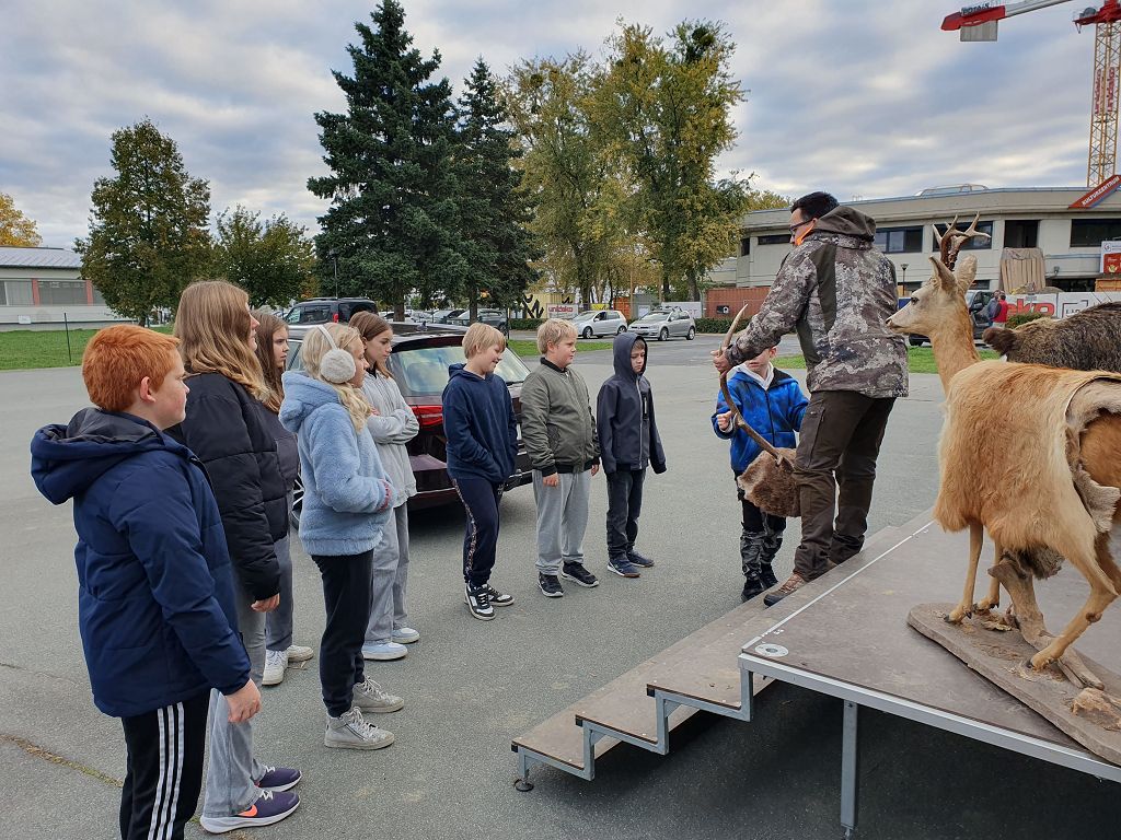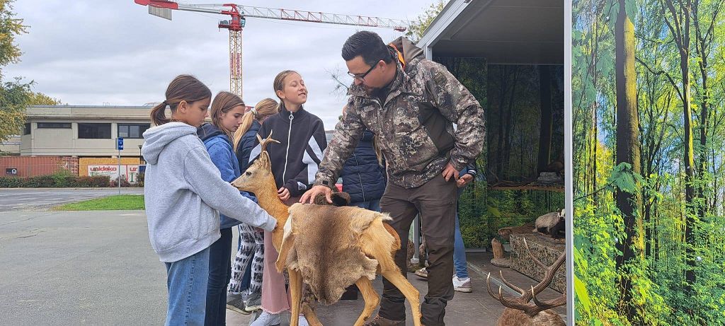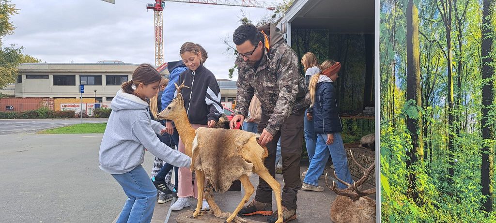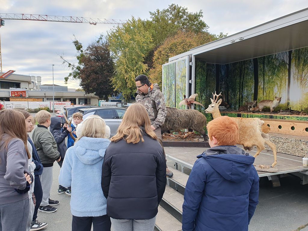 Unter der Leitung der Waldpädagogen Alexandra Laky und Michael Mayer konnten die Kinder der 2. Klassen am 14.10.2024 einen spannenden Workshop erleben. Im Anhänger der "Werkstatt Natur" gab es viel zu erklären und anzugreifen. Besonders begeistert waren die Kinder von der Möglichkeit, mit dem Fernglas die Umgebung zu erkunden.