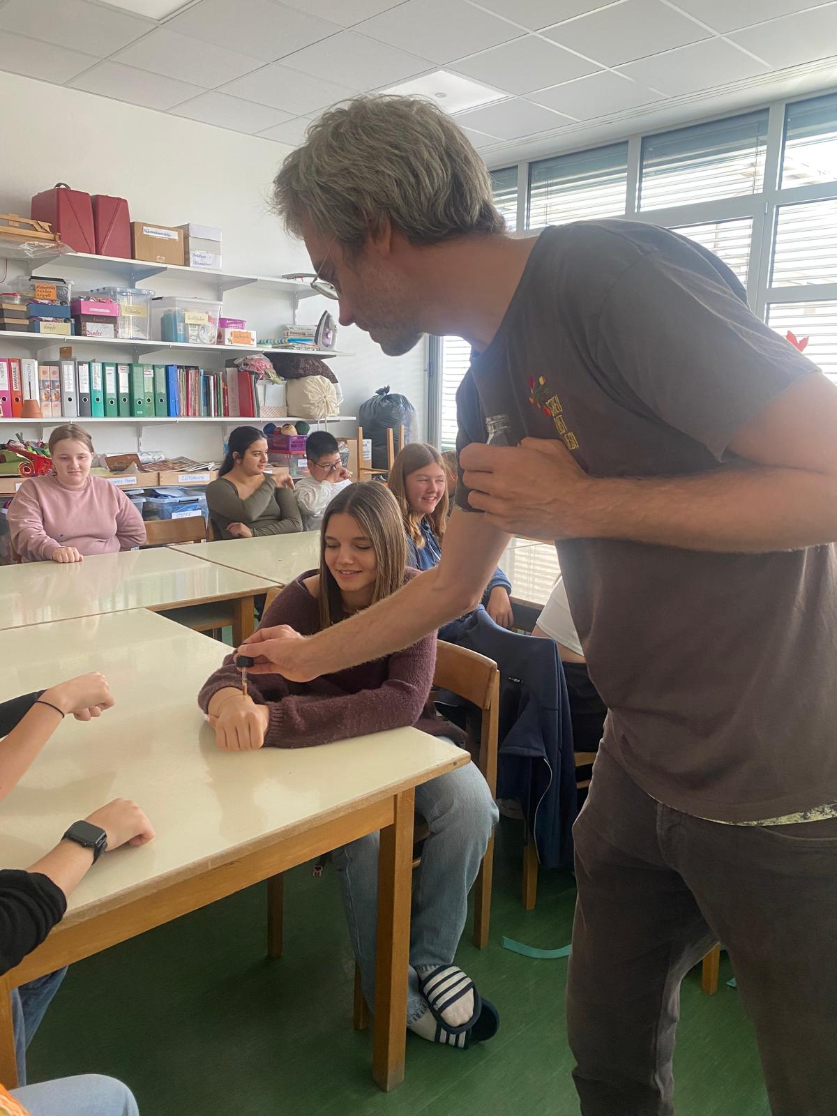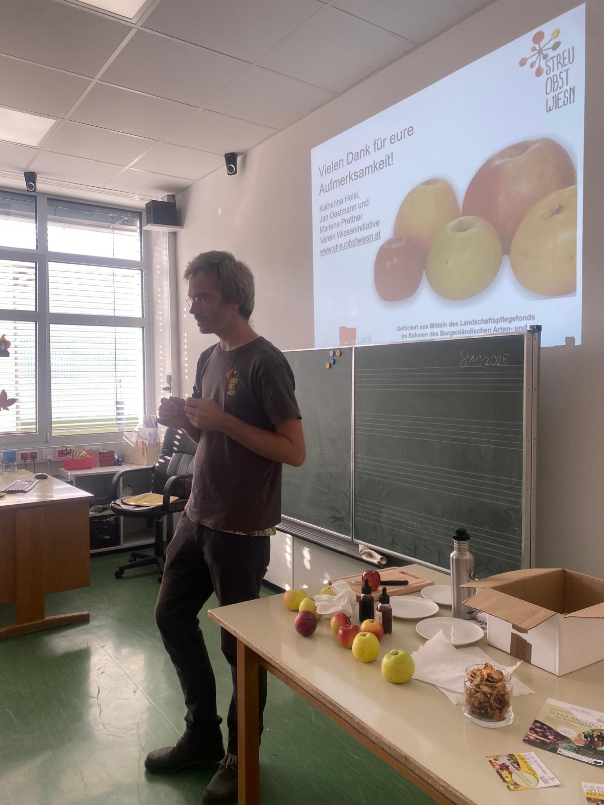 Am 8. Oktober 2025 fand für die Kinder der Nachmittagsbetreuung und der KIMS-Gruppe ein spannender Vortrag der Wieseninitiative statt. Die Schülerinen und Schüler erfuhren, welche Obstsorten es in den Streuobstwiesen der Region gibt, welche Produkte aus dem Obst hergestellt werden und welche Tiere und Pflanzen im Ökosystem Streuobstwiese vorkommen.